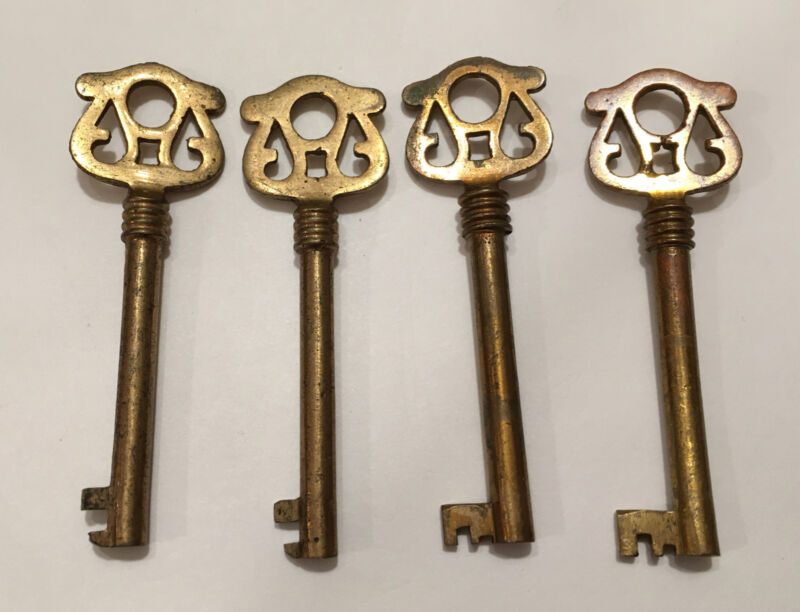 4 Brass Vintage Antique Furniture Lock Skeleton Open Barrel Cabinet Keys Unique