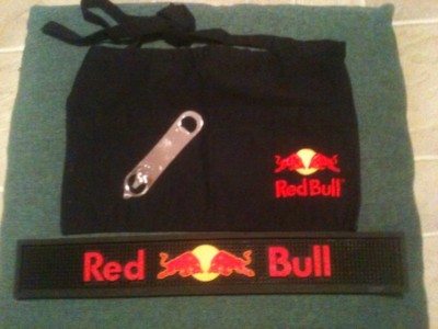Title (ebay affiliate link): RED BULL APRON, BAR MAT, BOTTLE/ RED BULL CAN OPENER!!!