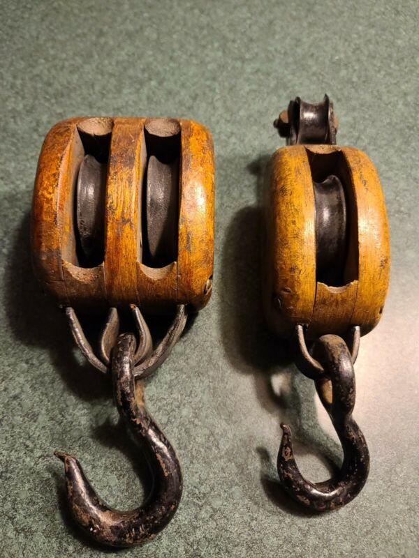 Title (ebay affiliate link): Vintage Wood Block Double and single Pulley w/ Large Hook cast iron.