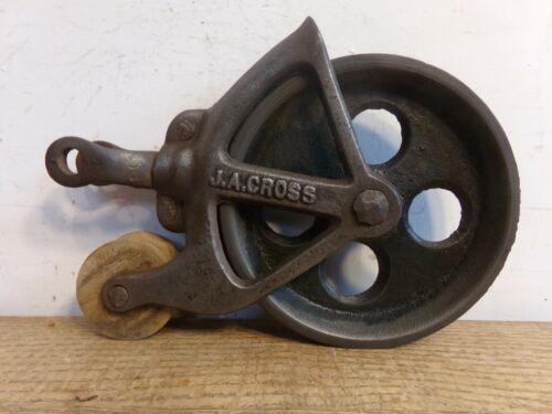 Title (ebay affiliate link): Vintage cast Iron J.A. Cross Fultonville NY Barn Pulley W/Wooden Pulley