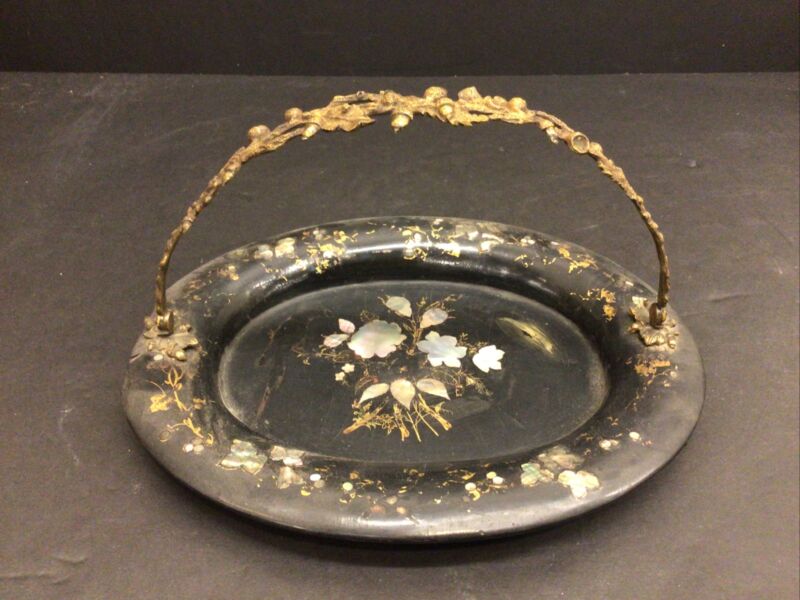 Title (ebay affiliate link): Antique Paper Mache Cake Dessert Serving Dish Mother of Pearl Bronze Handle