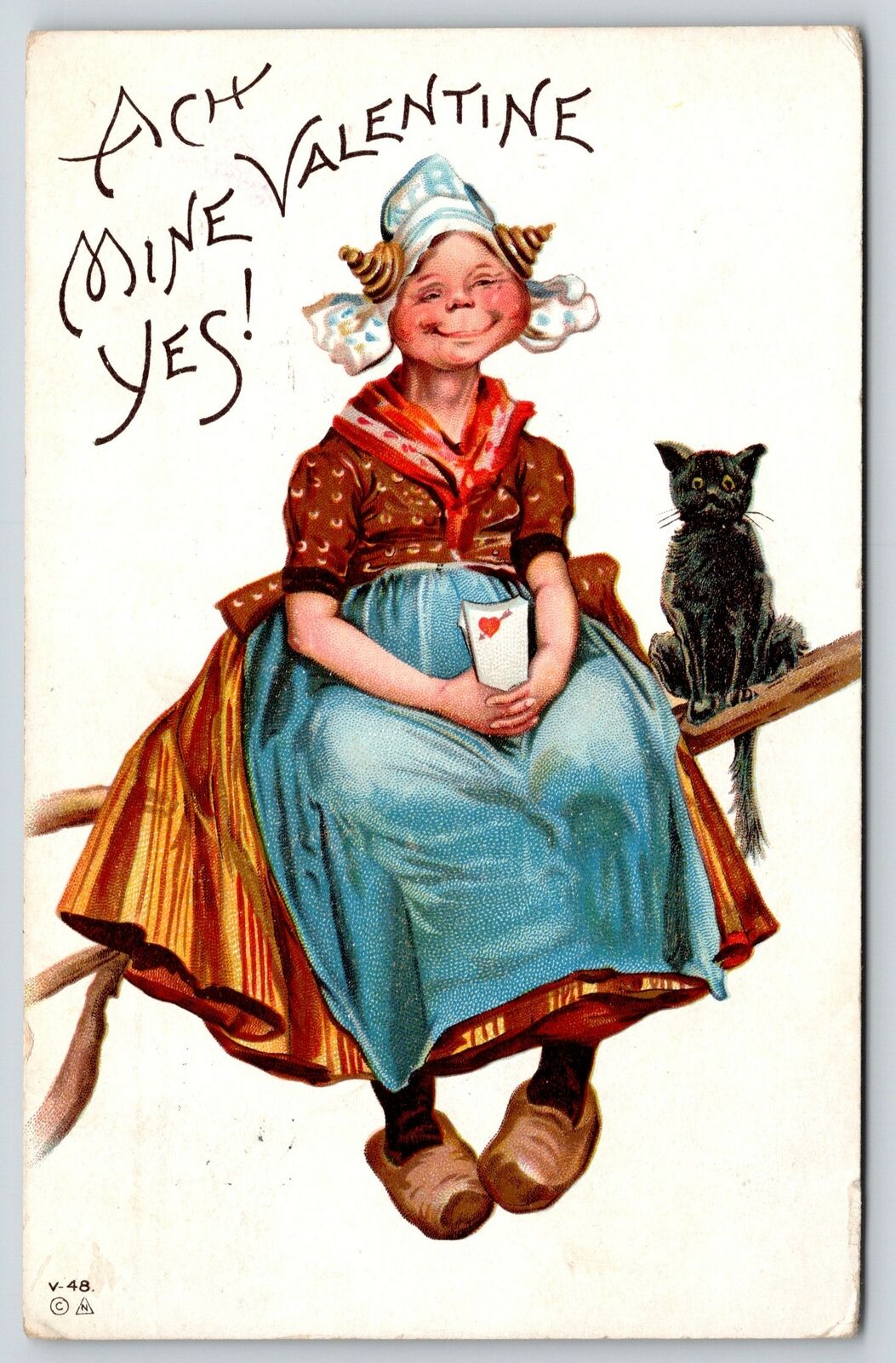 Brundage Valentine~Dutch Girl on Tree Branch w/ Black Cat~Holds Card~NASH V-48