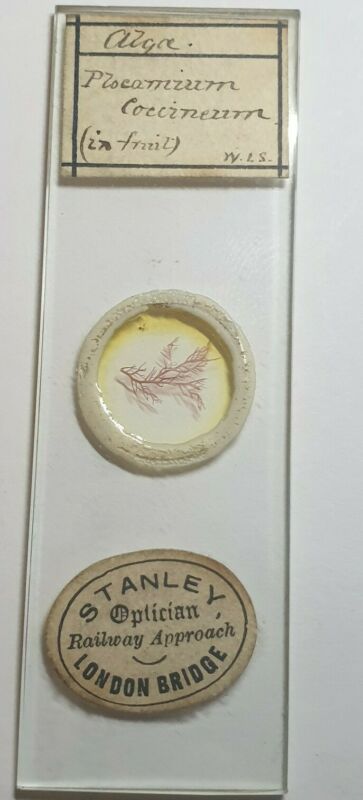 Title (ebay affiliate link): VERY FINE ANTIQUE MICROSCOPE SLIDE MARINE ALGAE IN FRUIT. BY STANLEY.