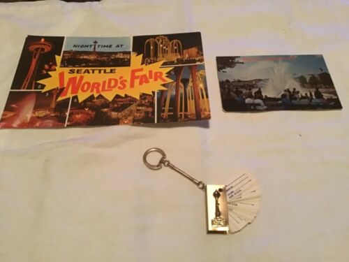 VINTAGE SEATTLE WORLD''S FAIR 1962 KEY CHAIN KEY RING/address book + 2 Postcards