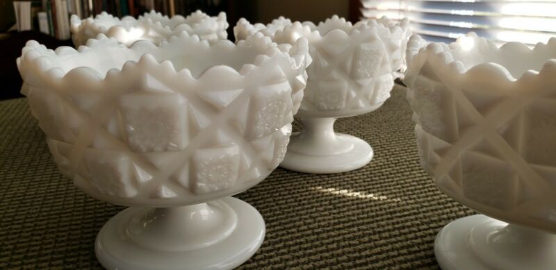 Title (ebay affiliate link): 4 Vintage Westmoreland Pedestal Milk Glass Quilt Pattern Sherbet Dishes