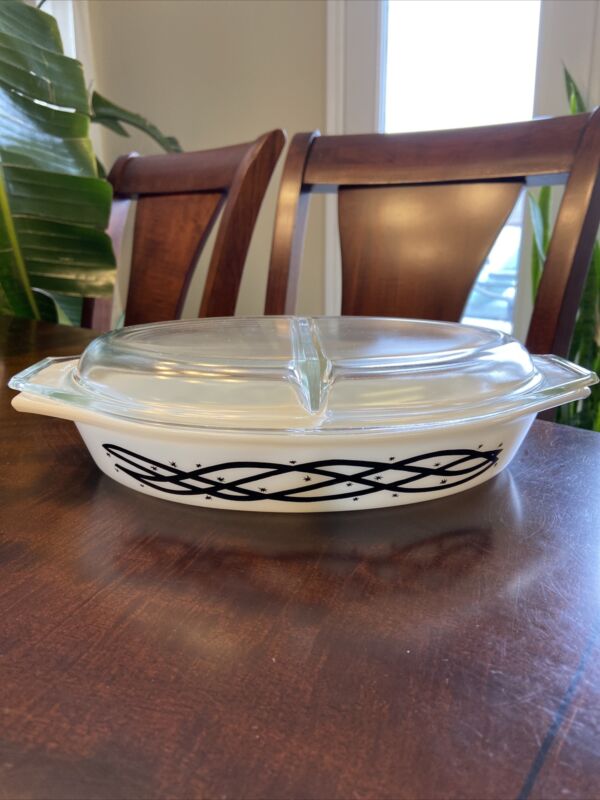 VINTAGE PYREX BARBED WIRE BLACK DIVIDED DISH CASSEROLE WITH LID 1 1/2 QUART