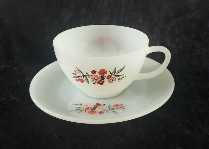 Fire King Anchor Hocking Vintage Milk Glass Primrose Cup Saucer Made USA Floral