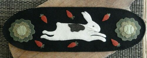 ~pRiMiTiVe Wool Applique Spring Penny Rug~In the Cabbage Patch~Rabbit~Easter~
