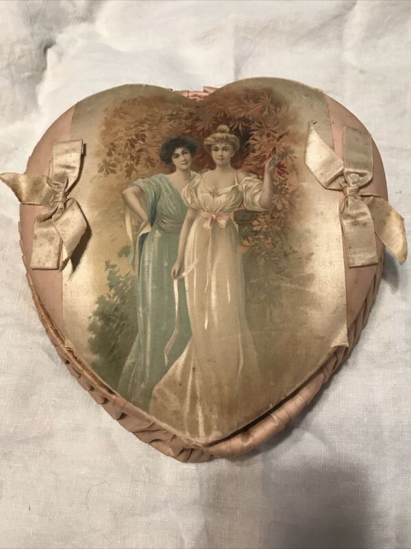 Title (ebay affiliate link): Antique Victoria Fabric (Silk, I Think) Covered Heart Box, 2 Ladies
