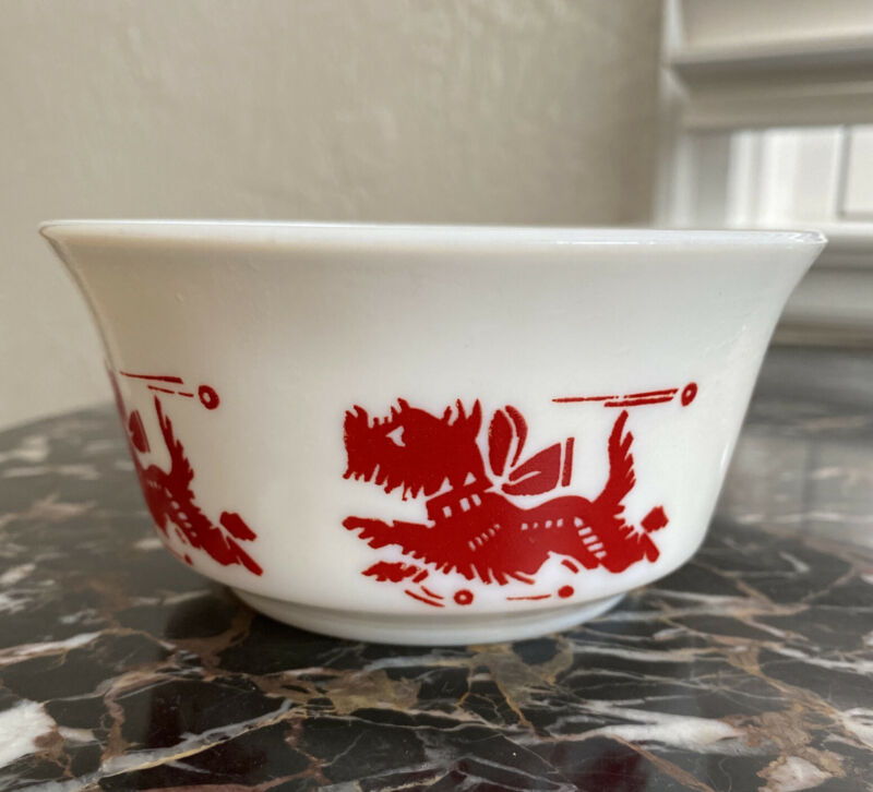 Hazel Atlas Milk Glass Red Scottie Dogs Running Cereal Bowl Vintage