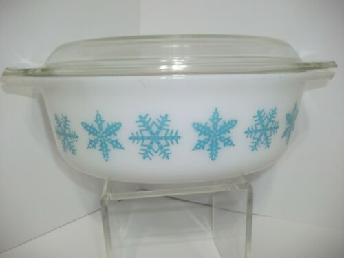 Title (ebay affiliate link): PYREX Snow Flake Casserole Dish 1.5 QT w/lid Blue 043 Turquoise Milk Glass Bake