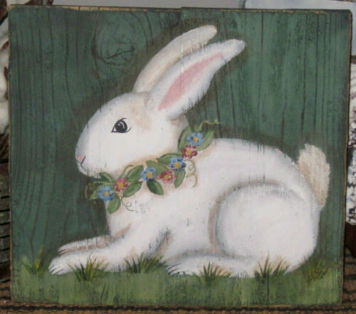 *~*PRIMITIVE*~* HP FOLK ART PRIM BUNNY * FLOWERS * SPRING *~* RECLAIMED WOOD