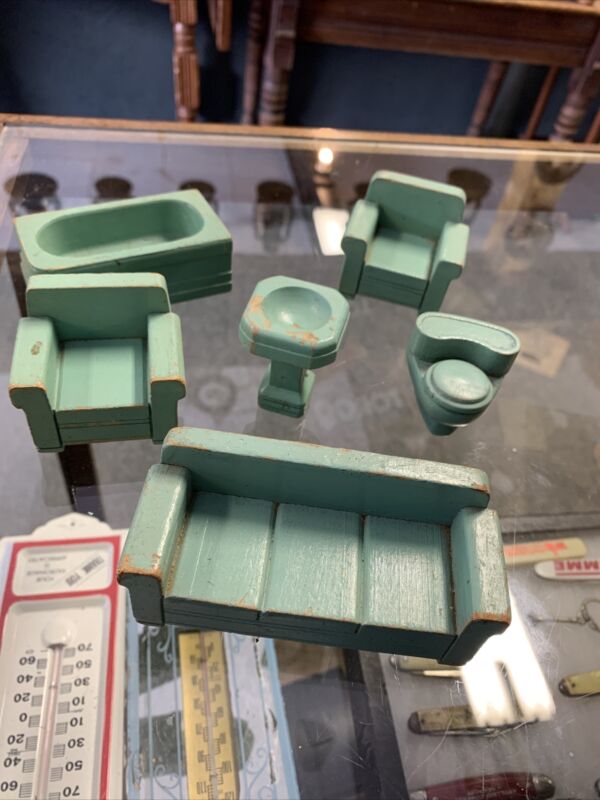 Title (ebay affiliate link): L VINTAGE WOODEN DOLLHOUSE FURNITURE BATHROOM SET, TOILET, SINK, TUB