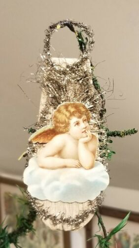 Title (ebay affiliate link): Raphael Angel, on Crepe Paper. Smaller elegant 1890s Tinsel & Paper Ornament