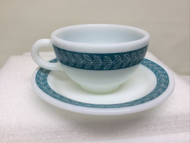 Vintage Pyrex Tableware Turquoise Blue Laurel Leaf Coffee Cup & Saucer 1960s