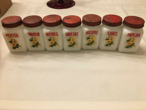 Title (ebay affiliate link): Vintage Yellow Flower Milk Glass Set of 7 Spice Jars- VGC!!