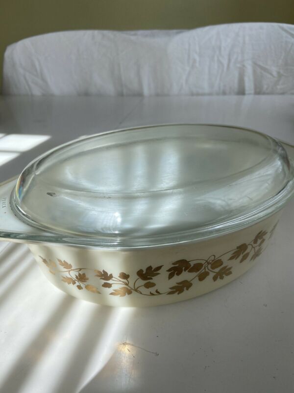 Title (ebay affiliate link): Pyrex Vintage Gold Leaf Acorn Casserole Dish 045 2-1/2 Qt with Lid Oval