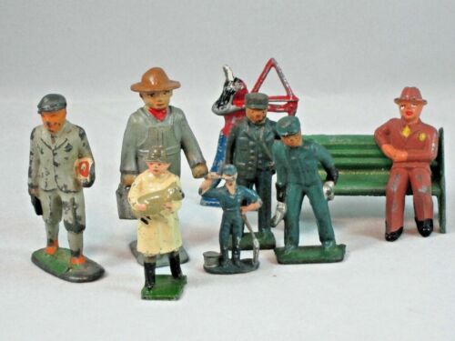 Title (ebay affiliate link): 9 PC LOT VINTAGE LEAD FIGURINES FARMER TRAIN INDIAN RAILROAD WORKER MAN ON BENCH