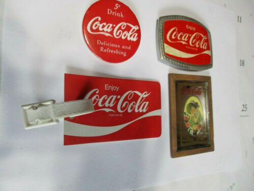 1 ENJOY COCA-COLA LUGGAGE TAG 1 METAL BUTTON 1 BELT BUCKLE 1 MIRROR 70s COKE