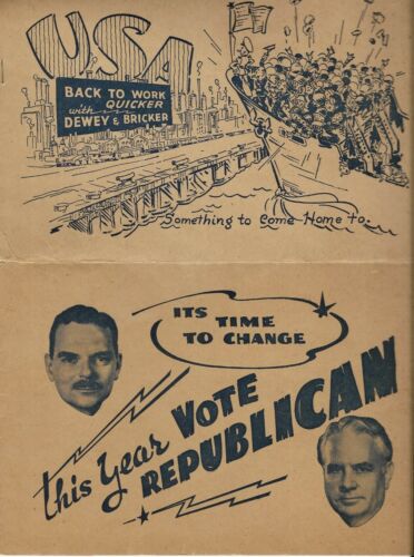Title (ebay affiliate link): DEWEY, BRICKER TIME TO CHANGE BACK TO WORK QUICKER OREGON 1944 CAMPAIGN CARD