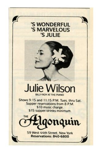 Title (ebay affiliate link): 1985 THE ALGONQUIN HOTEL - Julie Wilson - Billy Roy At Piano - NYC vtg print ad