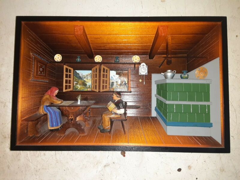 Title (ebay affiliate link): Vintage Thorens Diorama 3D Shadow Music Box Kitchen Scene Wood Carved Wall Art