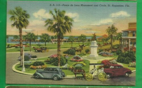 Title (ebay affiliate link): St. Augustine, Fl/ Ponce de Leon Monument & Circle/ old cars/ linen postcard
