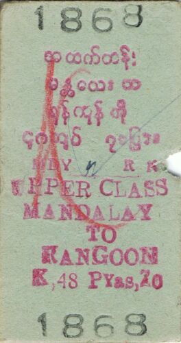 Title (ebay affiliate link): Railway tickets Burma Railways Mandalay to Rangoon adult upper class single 19??