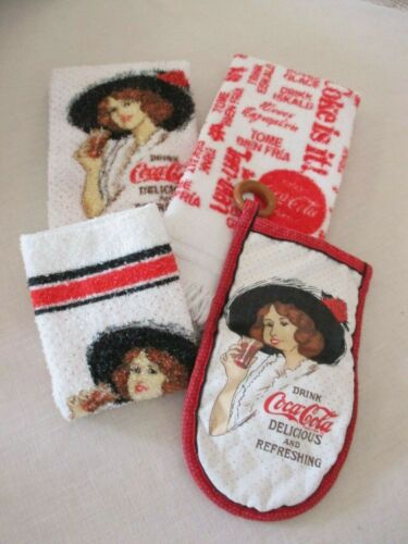 Title (ebay affiliate link): VINTAGE COCA~COLA Dish Towel Set~2 towels, 1 wash cloth, 1 oven mitt~ Pre-Owned