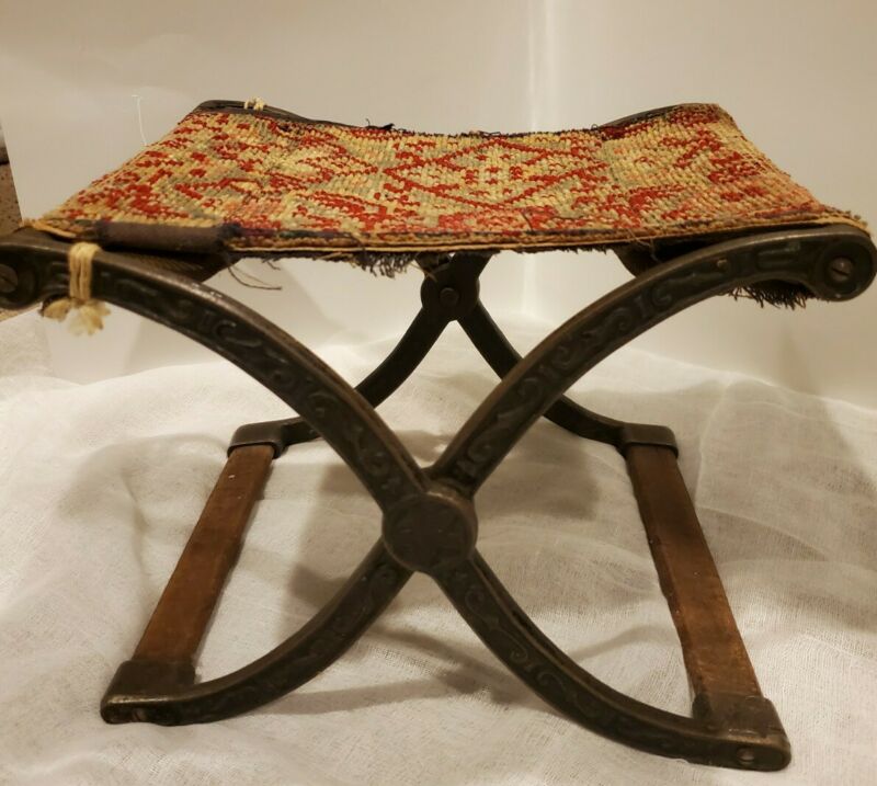 Unique Small Antique Foldable Seat with Wrought Iron Base & Tapestry Seat