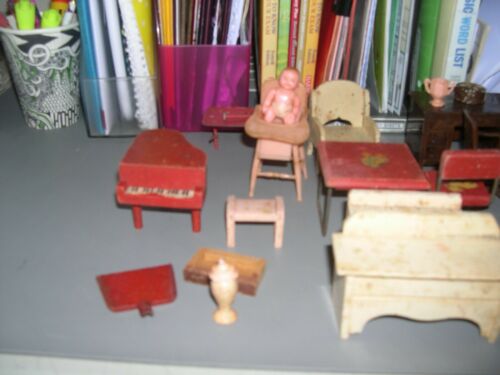 Title (ebay affiliate link): MIXED LOT VINTAGE DOLLHOUSE FURNITURE WOOD DESK,LUCITE BABY CHAIR,PIANO AND MORE