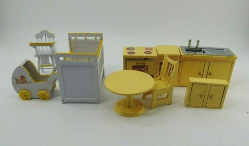 Title (ebay affiliate link): Vintage Dollhouse Furniture Wood Lot Kitchen Baby Crib Sink Table Chair
