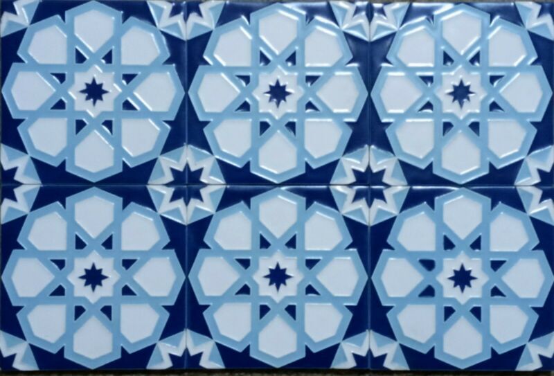6 Vintage Ceramic Tiles USA Blue and White Geometric Star 4 x 4