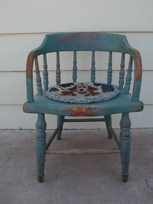 Title (ebay affiliate link): Small Antique Blue Childs Chair with Hooked Dog Pad