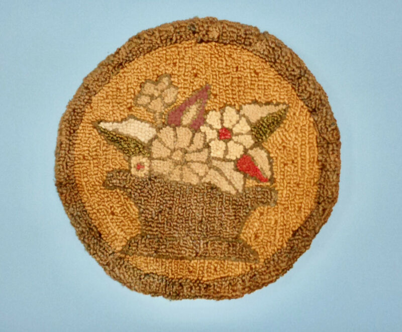 Title (ebay affiliate link): ANTIQUE HAND HOOKED RUG FLOWER BASKET CHAIR MAT PRIMITIVE SEAT TABLE COVER AAFA