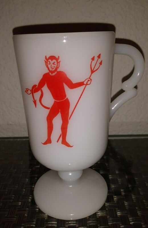Title (ebay affiliate link): Vintage Red Devil White Glass Coffee Mug Cup 6 OZ Milk Glass? Marked 24