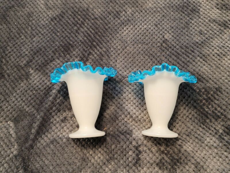 VINTAGE,FENTON VASES, SET OF 2, WHITE MILK GLASS, AQUA BLUE CREST, CRIMPED EDGE