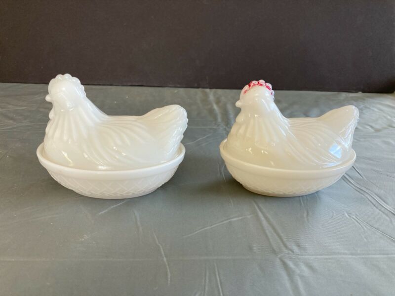 Vintage Milk Glass Hen on Nest Dish Bowl Lot of 2