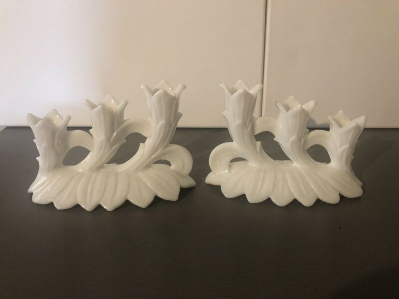 Title (ebay affiliate link): PAIR OF RARE MILK GLASS LOTUS TRIPLE CANDLE HOLDER Great Condition