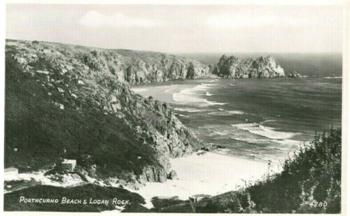 Title (ebay affiliate link): 1950s postcard Porthcurno Beach and Logan Rock Cornwall