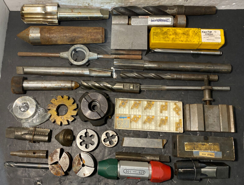 Title (ebay affiliate link): Lot of Machinist Tools Cutters Drill Mills HSS Carbide Taps Inspection Loaded