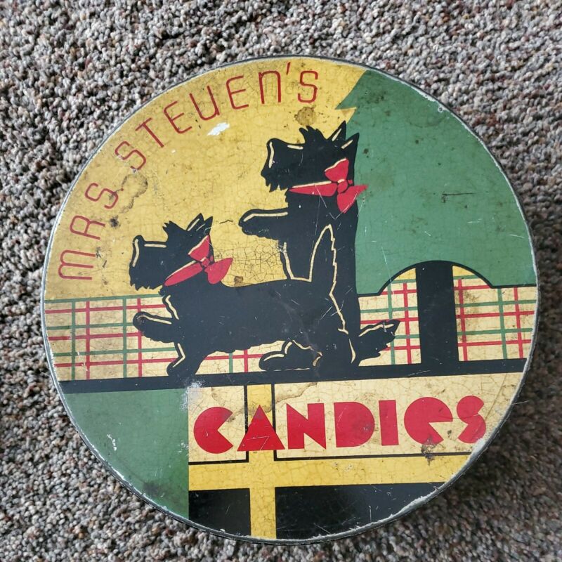 Title (ebay affiliate link): Vintage Rustic 9" Mrs. Steven''s Candies ROUND TIN Black SCOTTISH DOGS Red Bows