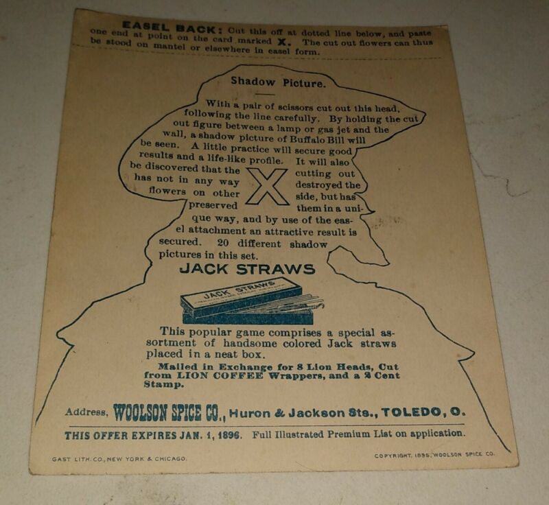 Antique 1895 Buffalo Bill Shadow Portrait Lion Coffee Wioolson Spice Co. RARE