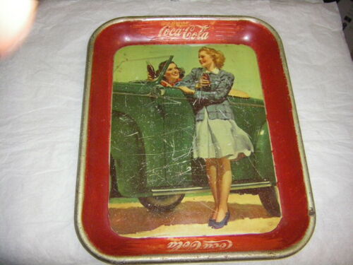 VINTAGE 1942 COCA COLA ADVERTISING DRINK TRAY TWO GIRLS & CAR