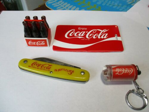 Title (ebay affiliate link): 1 ENJOY COCA-COLA LUGGAGE TAG 1 MINI 6 PACK BOTTLES 1 KEY CHAIN 1 KNIFE 70s COKE