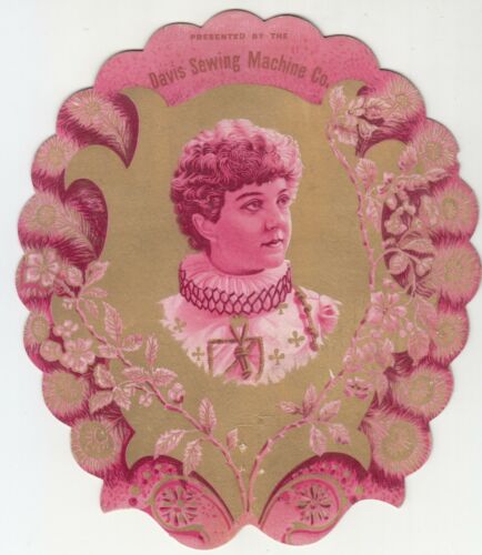 Title (ebay affiliate link): Davis Sewing Machine Gold Pink & Red Diecut Vict Lady Card c1880s