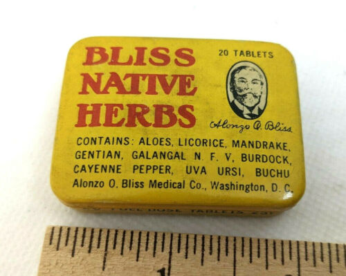 Title (ebay affiliate link): Vintage Bliss Native Herbs medicine tin vegetable laxative stimulant compound ca
