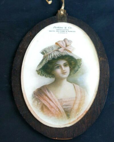 Title (ebay affiliate link): VINTAGE SACRAMENTO - PERKINS & CO. GROCERS - GLASS COVERED AD WITH LADY
