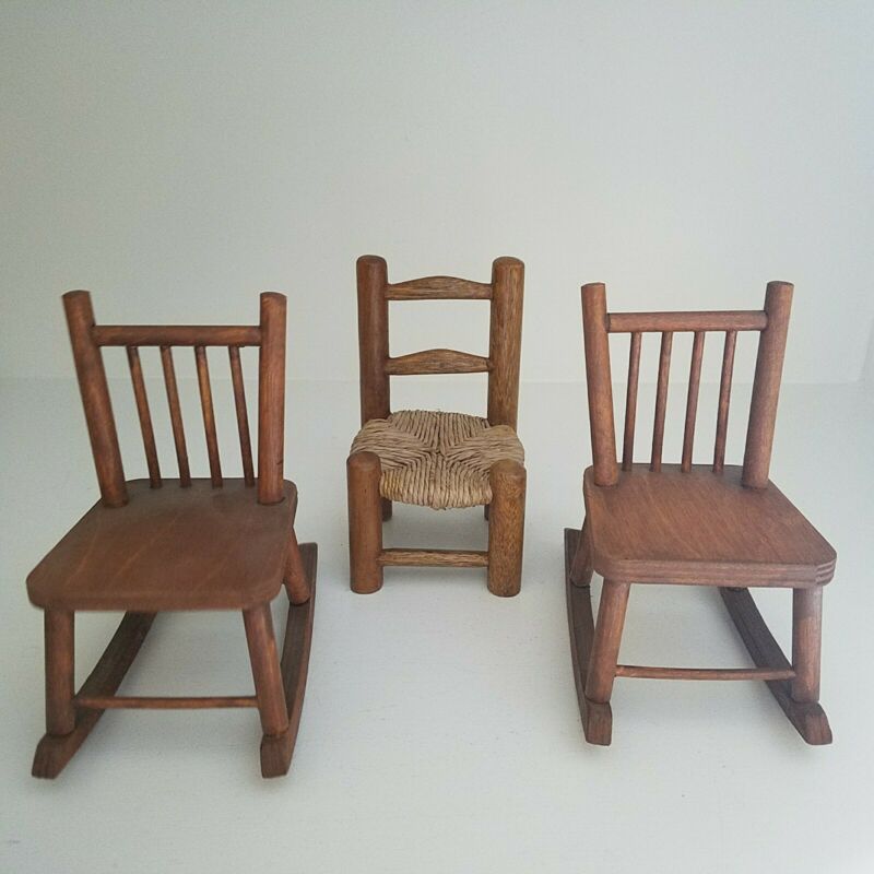 Title (ebay affiliate link): 2 Wooden Doll/Bear Rocking Chairs and 1 Wooden Regular Chair