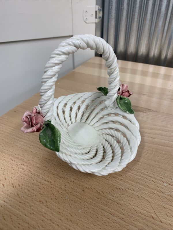 LARGE Capodimonte Vintage Porcelain Flower Basket Italy Handle Roses Woven
